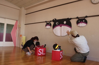 アンパンマンに変身して、SLマンにご飯をあげましょう。みんなからご飯をもらってSLマンも元気もりもりになりました。
