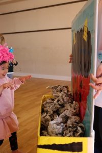鬼めがけて力いっぱい新聞ボールを投げました。